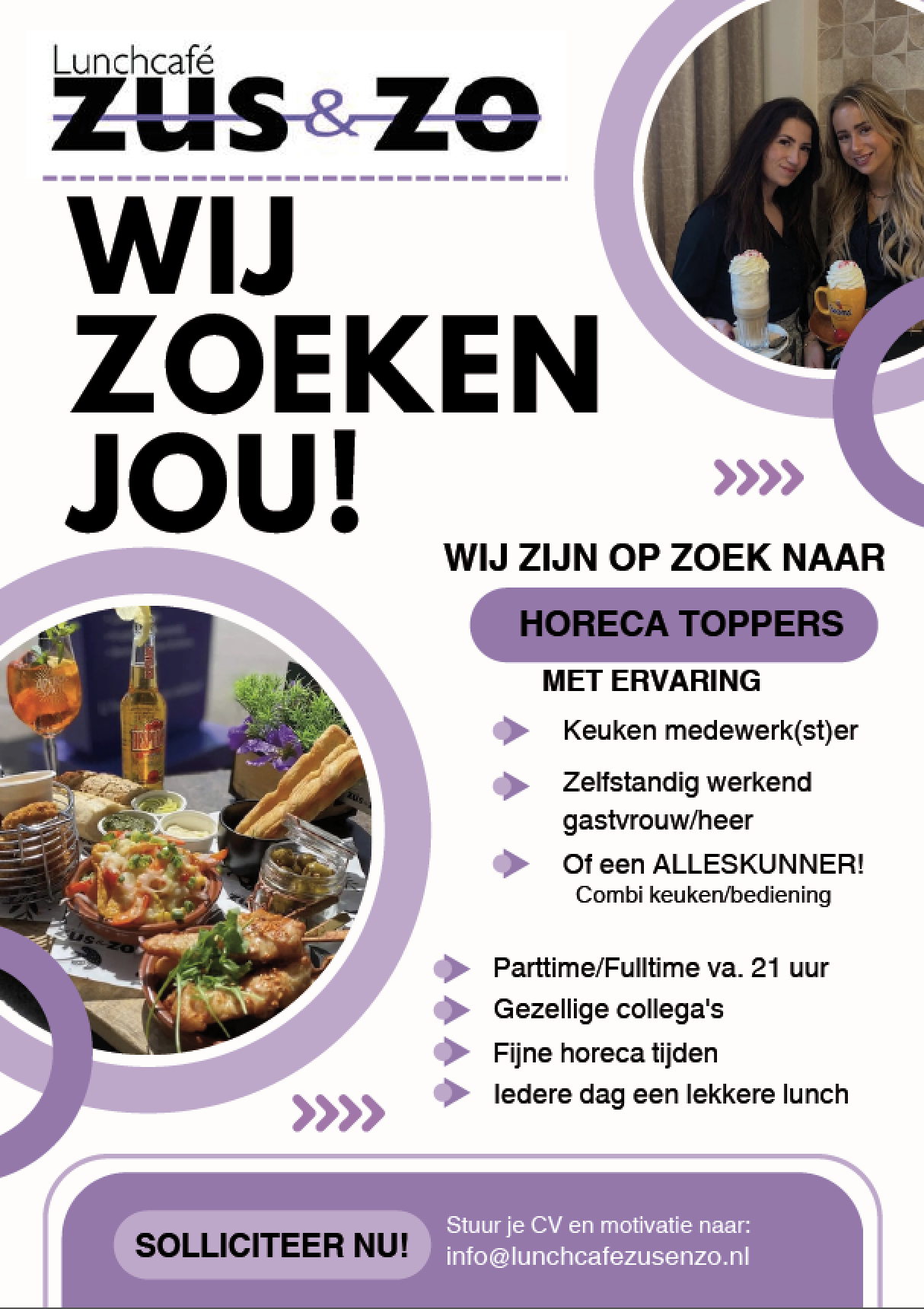 Stuur je motivatie en C.V. naar Lunchcafé Zus&zo T.a.v. Tessa/Arlette | info@lunchcafezusenzo.nl
